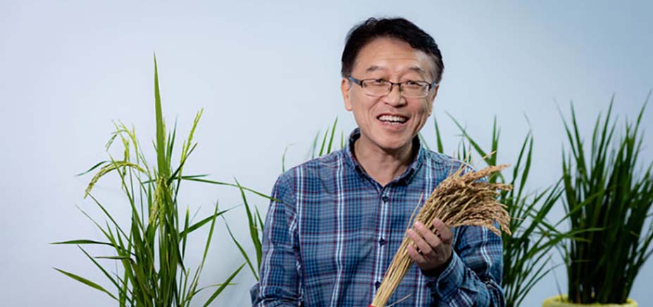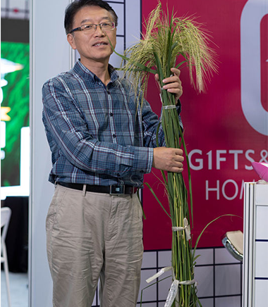 楊記磙教授手持此次在喀什帕鄉(xiāng)種植的“海稻4號”